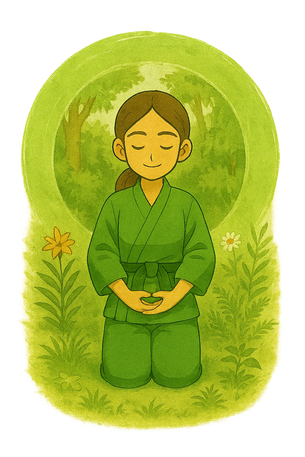 Hanas Ensō-Kreis ist grün, die Farbe des Waldes, der Heilung und der Harmonie. Er erinnert sie daran, dass alles Leben miteinander verbunden ist. Grün steht für Erneuerung, Hoffnung und Lebenskraft - Eigenschaften, die Hana in jede Begegnung hineinträgt.